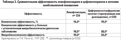 Сравнительный анализ показал, что клиническая и микробиологическая эффективность монотерапии левофлоксацином (назначавшимся в т.ч. и в рамках ступенчатой терапии) оказалась достоверно выше традиционных схем лечения внебольничной пневмонии (цефтриаксон ± цефуроксим аксетил±эритромицин или доксициклин) при сопоставимой частоте нежелательных явлений — 5,8 и 8,5% соответственно. Причем это превосходство никак не было связано с известным преимуществом фторхинолона перед цефалоспоринами в отношении «атипичных» возбудителей (табл. 3). В еще одном исследовании изучалась сравнительная эффективность левофлоксацина в рамках ступенчатой терапии (500 мг 2 раза в сутки) и цефтриаксона (4,0 г 1 раз в сутки) у больных с тяжелой внебольничной пневмонией [31]. Свидетельствами исходно тяжелого состояния пациентов являлось сопоставимое в обеих группах количество больных с интегральной оценкой по шкале APACHE II > 15 баллов (21%), а также показатель летальности — 7%. В группе получавших левофлоксацин всем больным внутривенно было введено не менее 4 доз препарата, и большинство пациентов (87%) со временем перешли на прием антибиотика внутрь.