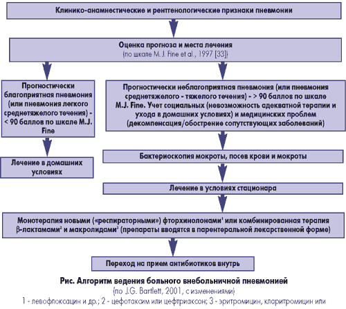Как уже говорилось выше, такие свойства левофлоксацина, как возможность введения препарата в парентеральной и пероральной лекарственных формах, доказанная клиническая эффективность при лечении инфекций дыхательных путей, практически абсолютная биодоступность, безопасность, отсутствие клинически значимых лекарственных взаимодействий, хорошая переносимость при приеме внутрь, длительный интервал дозирования создают образ «идеального» антибиотика для ступенчатой терапии внебольничной пневмонии. И в проведенных к настоящему времени исследованиях, включавших в т. ч. и больных с тяжелым и (или) прогностически неблагоприятным течением заболевания, были получены убедительные свидетельства превосходящей или, по меньшей мере, сопоставимой клинической и микробиологической эффективности монотерапии левофлоксацином по сравнении с традиционным комбинированным лечением (цефалоспорины + макролиды). Это обстоятельство, а также прекрасный профиль безопасности, подтвержденный многолетней практикой широкого клинического применения, и очевидные экономиче-ские преимущества монотерапии объясняют присутствие левофлоксацина в современных схемах лечения внебольничной пневмонии, особенно в условиях стационара (рис.).