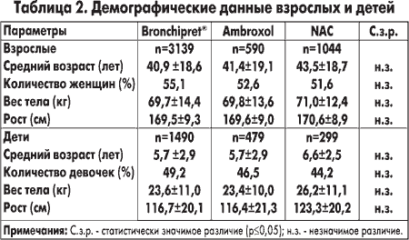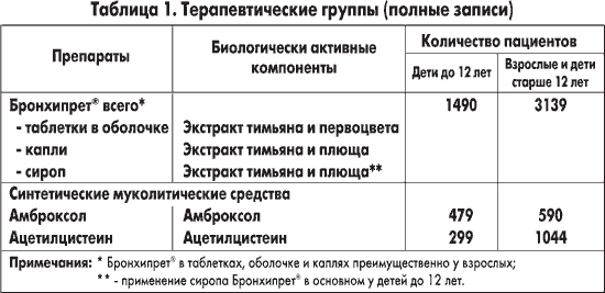 Из исследования были исключены пациенты, нуждавшиеся в базисной антиобструктивной терапии обструктивного заболевания дыхательных путей (астма, хронические обструктивные заболевания легких — ХОЗЛ). В случае необходимости по решению врача в дополнение к муколитикам одновременно назначались антибиотики. Готовые препараты — комбинации ацетилцистеина или амброксола с антибиотиками — в исследовании не назначались.