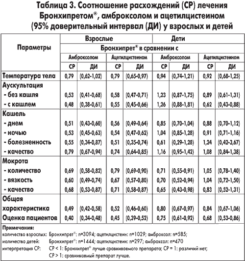 В таблице 3 обобщено соотношение исследуемых параметров для взрослых и детей. При соотношении расхождений, равном единице, оба лекарственных средства показывали одинаковую эффективность: чем оно ниже, тем выше превосходство Бронхипрета®. Так, к примеру, соотношение расхождений, равное 0,5, означает, что лечение синтетическим муколитическим препаратом оказалось наполовину менее эффективным, чем терапия с помощью Бронхипрета®.