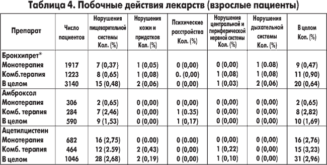 Приведенные в таблице 4 данные показывают, что при лечении Бронхипретом® сообщений о ПДЛ было значительно меньше, что свидетельствует о его превосходстве перед амброксолом и ацетилцистеином. Лишь в группе детей моложе 12 лет, лечившихся амброксолом, частота ПДЛ была ниже, чем при Бронхипрете®.