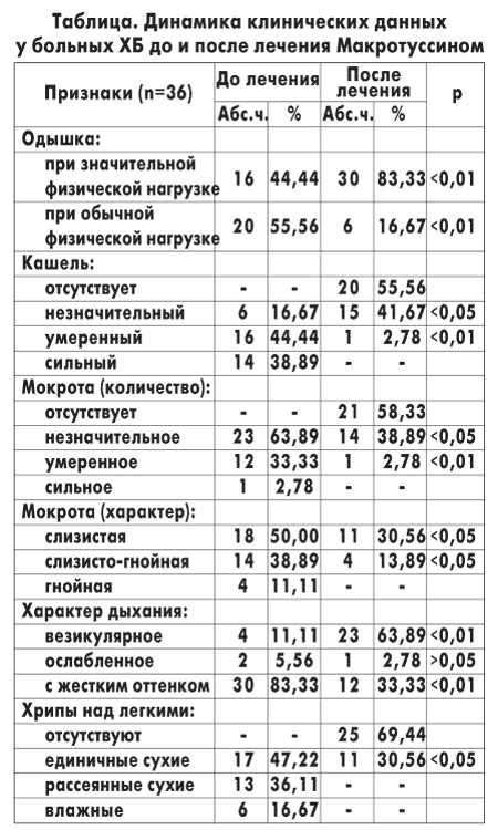 В настоящей работе приведены результаты изучения клинической эффективности комбинированного препарата Макротуссин у больных с обострением ХБ. В исследовании участвовали 36 больных ХБ в возрасте от 20 до 60 лет, среди которых было 24 (66,67%) мужчины и 12 (33,33%) женщин. Средний возраст обследованных составил 46,4 ± 6,9 лет. Хронический необструктивный бронхит (ХНБ) диагностирован у 15 (41,67%) пациентов, хронический гнойно-обструктивный бронхит (ХГОБ) — у 21 (58,33%). Все больные, наблюдавшиеся нами, имели клинические, лабораторные и функциональные признаки ХБ в фазе обострения: у больных ХГОБ преобладали жалобы на одышку при физической нагрузке, кашель с отделением слизистой или слизисто-гнойной мокроты, а также симптомы интоксикации, субфебрильная температура тела. Больные ХНБ преимущественно жаловались на кашель с отделением слизистой или слизисто-гнойной мокроты, слабость, повышенную утомляемость, в ряде случаев субфебрильную температуру тела, одышку.