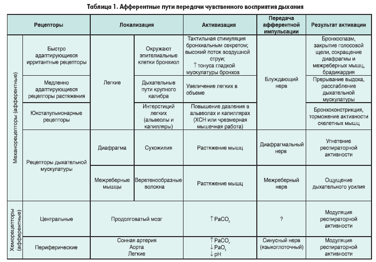 Афферентные хеморецепторы (центральные и периферические), механорецепторы дыхательных путей, паренхимы легких, мышц грудной клетки и диафрагмы обеспечивают сенсорную обратную связь через блуждающий, диафрагмальный и межреберные нервы к спинному, продолговатому мозгу и высшим нервным центрам [4]. При этом происходит как непосредственное «оповещение» высших мозговых структур о состоянии гомеостаза, так и косвенное осознание моторной дыхательной активности через передачу эфферентной копии сигнала из продолговатого мозга в высшие нервные центры [44]. Все это может играть существенную роль в формировании чувства одышки. Характеристика афферентных путей передачи чувственного восприятия дыхания приведена в таблице 1.