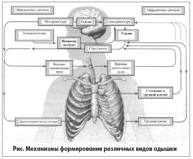 Некоторые из механизмов формирования различных видов дыхательного дискомфорта изображены на рисунке.