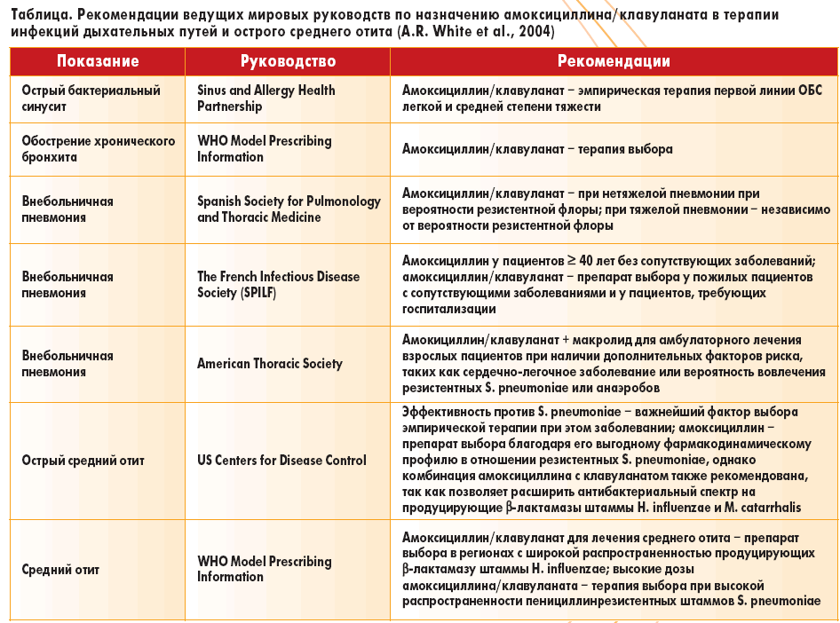 Развитие и распространение антибактериальной резистентности основных патогенов инфекционных заболеваний дыхательных путей значительно снизило эффективность некоторых широко используемых антибиотиков, в основном с субоптимальными фармакокинетическими и фармакодинамическими параметрами. Однако это не относится к амоксициллину/клавуланату, который после более 20 лет клинического применения сохранил высокую антибактериальную эффективность. Оптимизированные для максимальной эрадикации возбудителя параметры фармакокинетики/фармакодинамики позволяют не только увеличить частоту клинического и бактериологического излечения, но и замедлить развитие и распространение резистентных штаммов. Фармакокинетический/фармакодинамический профиль амоксициллина/клавуланата обеспечивает сохранение антибактериальной активности против продуцирующих β-лактамазы штаммов H. influenzae и M. catarrhalis, а также многих нозокомиальных штаммов S. pneumoniae со сниженной чувствительностью к пенициллинам. Большинство инфекций дыхательных путей лечат эмпирически, поэтому при выборе антибактериального препарата важно учитывать все основные респираторные патогены и возможную резистентность к антибиотикам. Рекомендации по противомикробной терапии инфекций дыхательных путей должны быть основаны на принципе целевой бактериальной эрадикации и отражать региональную резистентность (P. Ball и соавт., 2002). Хотя руководства по лечению респираторных инфекций неодинаковы в различных странах, амоксициллин/клавуланат закономерно включен в ведущие рекомендации (табл.). Это отражает высокую клиническую и бактериологическую эффективность препарата против S. pneumoniae и продуцирующих β-лактамазы H. influenzae и M. catarrhalis. Кроме того, амоксициллин/клавуланат – хорошо известный препарат с установленным профилем безопасности, назначенный более 819 млн пациентов во всем мире. Возможность применения высоких доз амоксициллина/клавуланата, в частности разработанной пролонгированной формы, позволяет чаще достигать успеха при вовлечении в патологический процесс резистентных микроорганизмов и, что имеет огромное значение, минимизировать селекцию и появление резистентных штаммов в будущем. Уникальная комбинация амоксициллина/клавуланата, изначально разработанная и усовершенствованная сегодня для борьбы с резистентными микроорганизмами, продолжает оставаться ценным клиническим инструментом для лечения инфекций дыхательных путей.