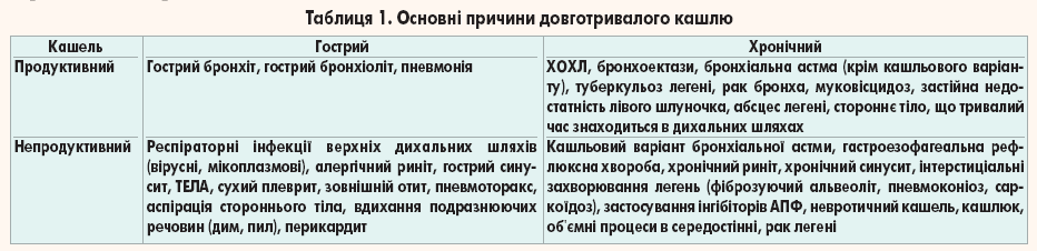 Основні причини довготривалого кашлю наведені в таблиці 1.