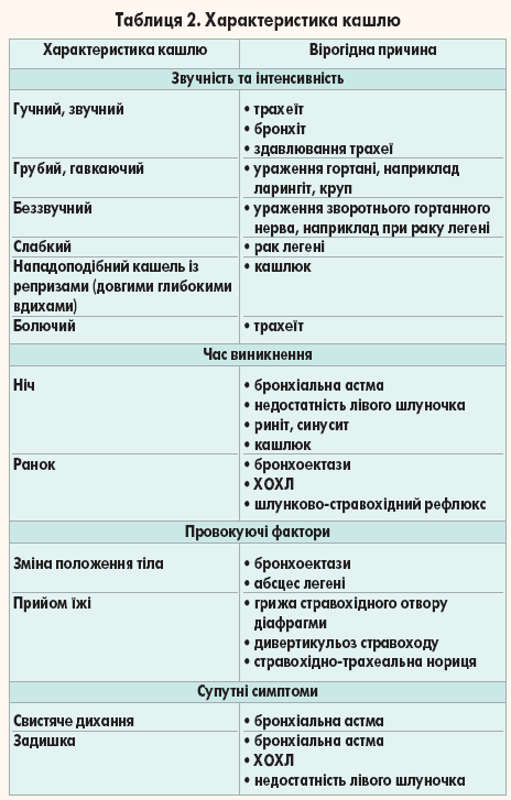 З'ясовують характер і особливості кашлю та наявність супутніх симптомів: мокротиння (його колір та характер), задишки, хрипів, лихоманки. Деякі особливості кашлю дозволяють з'ясувати його причину (табл. 2).