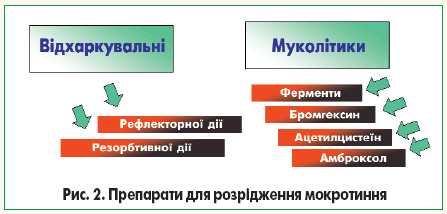 На рисунку 2 представлені препарати для розрідження мокротиння. Як зазначалось вище, арсенал мукоактивних препаратів досить широкий, і кожна група має свої переваги та недоліки.