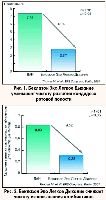 Доказано, что при применении Беклазона Эко Легкое Дыхание достоверно снижается частота использования антибиотиков и кандидоза полости рта (рис. 1, 2).