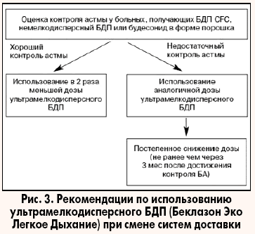 Какую же тактику должен выбрать врач при переводе пациента на другой ингалятор? Рекомендации по использованию ультрамелкодисперсного БДП при смене системы доставки представлены на рисунке 3. У больных с хорошим контролем бронхиальной астмы, вероятно, можно использовать более низкую (в 1,5-2 раза) дозу при замене ДАИ БДП (альдецин) с CFC и немелкодисперсного БДП (беклоджет) и будесонида в порошковом ингаляторе на ультрамелкодисперсный ингалятор (Беклазон Эко Легкое Дыхание). У больных с плохо контролируемой БА целесообразно сохранить прежнюю дозу БДП на 3 месяца. В дальнейшем при стабилизации состояния возможно ее снижение до минимально необходимой.