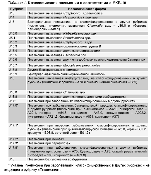 Не вызывает сомнения, что классификация, наиболее полно отражающая особенности течения пневмонии и позволяющая обосновать этиотропную терапию, должная быть построена по этиологическому принципу. Этот принцип положен в основу классификации пневмонии, представленной в МКБ-10 (табл. 1). Однако на практике этиологическая диагностика пневмонии у 50-70% больных затруднена из-за недостаточной информативности и значительной продолжительности традиционных микробиологических исследований. Это отсутствие у 20-30% пациентов продуктивного кашля, невозможность выделения внутриклеточных возбудителей при использовании стандартных диагностических подходов (идентификация возбудителя возможна лишь через 48-72 часа после получения материала), трудности в разграничении «микроба-свидетеля» и «микроба-возбудителя», распространённая практика применения пациентами антибактериальных препаратов до обращения за медицинской помощью).