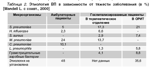 Этиологическая структура ВП может различаться в зависимости от возраста больных, тяжести заболевания, наличия сопутствующей патологии. У пациентов, госпитализированных в терапевтическое отделение, в этиологии ВП преобладают пневмококки. На долю микоплазмы и хламидий суммарно приходится около 25%. Напротив, последние не имеют существенного значения в этиологии тяжелой ВП, требующей лечения в ОРИТ. В то же время, у этой категории больных возрастает роль Legionella spp., а также S. aureus и грамотрицательных энтеробактерий (табл. 2).