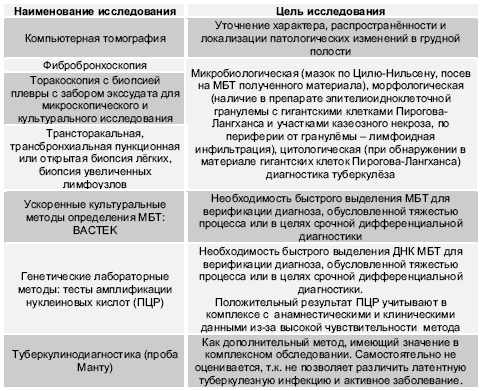 Следует стараться верифицировать диагноз лабораторными и морфологическими методами с забором материала (индуцированная мокрота, промывные воды бронхов, экссудат, биоптат), который может быть исследован методом микроскопии, посева или морфологически.