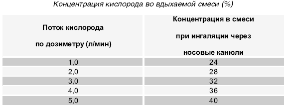 Эффективность оксигенации должна контролироваться по изменению показателей пульсоксиметрии или газового анализа крови и уже в соответствии с этими данными должна устанавливаться концентрация О2 и другие параметры оксигенотерапии. В любом случае концентрация кислорода во вдыхаемой смеси не должна превышать 40%, что соответствует величине потока кислорода 5 л/мин при вдыхании через носовые канюли.