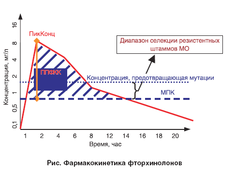 ФХ являются дозозависимыми (концентрационнозависимыми) препаратами. То есть их клиническая эффективность зависит преимущественно не от кратности приема, а от разовой (пиковой) дозы препарата и отношения этой пиковой концентрации (ПикКонц) и площади под фармакокинетической кривой (ППФКК) к минимально подавляющей концентрации (МПК) АБП в отношении конкретного МО. Обычно для достижения клинической эффективности требуется, чтобы отношение ППФКК к МПК превышало 20-40, а для ряда МО – даже 100-200 (грамотрицательные МО). Большое значение имеет и концентрация, подавляющая возможные мутации, которая, вероятно, совпадает с максимальной подавляющей концентрацией. В диапазоне между этой концентрацией и МПК находится диапазон, в котором возможно появление резистентных штаммов МО, а из доступных у нас РФХ по отношению к пневмококку лучших фармакокинетических показателей, предотвращающих селекцию мутантов, достигает моксифлоксацин. Кроме того, недавно установлено, что в предотвращении селекции резистентных МО важную роль играет отношение ПикКонц к МПК, – желателен показатель более 10 (рисунок).