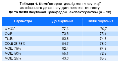 За даними дослідження мокротиння, відмічено позитивні впливи Трайфеда експекторанта на в’язкість мокроти, що є дуже важливим моментом дії муколітичного препарату, позитивну репаративну дію на альвеолярний епітелій, який є значущим сегментом дихальної системи, що відіграє найважливішу роль у газообміні та активному диханні, а також протизапальний ефект препарату. Дослідження функції зовнішнього дихання теж дало позитивні результати (табл. 4).