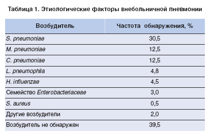В Международной классификации болезней, травм и причин смерти Х пересмотра (1992) из рубрики «Пневмония» исключены заболевания, спровоцированные физическими факторами и факторами аллергического или сосудистого происхождения, а в основу классификации положена этиология. Безусловно, классификация пневмонии, основанная на типе ее возбудителя, является оптимальной, поскольку позволяет обосновать этиотропную терапию. На сегодняшний день выделены патогены, чаще всего вызывающие внебольничную пневмонию (ВП) (табл. 1).