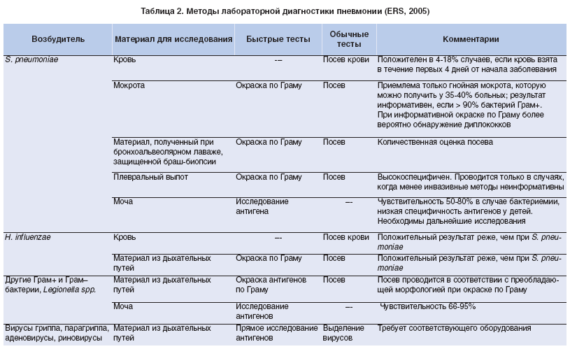 Методы лабораторной диагностики пневмонии, предложенные ERS (2005), представлены в таблице 2 [16].