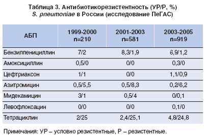 Все вышеизложенное заставляет медиков периодически обновлять свои рекомендации с учетом результатов новейших исследований ключевого фактора, определяющего характер терапии, – резистентности к антибиотикам. Постоянное изучение вопроса резистентности основных возбудителей к АБП значительно упрощает работу клиницистов. Результаты недавно проведенного масштабного российского 6-летнего исследования ПеГАС позволяют и нашим врачам грамотно подбирать антибактериальную терапию больным ВП. Данные по резистентности S. pneumoniae [5, 6] (одного из наиболее распространенных возбудителей ВП) в России представлены в таблице 3.