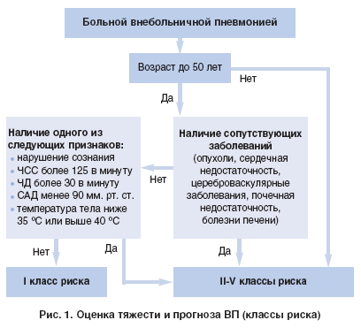 На рисунке 1 отображен алгоритм оценки степени риска больных ВП, предлагаемый российскими пульмонологами.