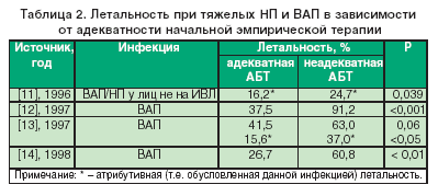 Установлено, что при тяжелых НП (главным образом, ВАП) неадекватная на начальном этапе антимикробная терапия сопровождается достоверным увеличением летальности (табл. 2). Более того, последующая коррекция неадекватной терапии (после получения результатов микробиологического исследования) не улучшает результатов лечения [11].