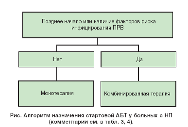 В прежних рекомендациях АТО указывалось, что спектр вероятных возбудителей НП можно очертить при оценке следующих трех факторов: степени тяжести заболевания; наличия или отсутствия факторов риска, предрасполагающих к инфицированию теми или иными возбудителями; времени возникновения НП (ранняя или поздняя) [3]. Соответственно, выделялись три группы пациентов, для которых были разработаны режимы эмпирической АБТ. В новом консенсусе АТО указывается на отсутствие связи между степенью тяжести заболевания и этиологией НП [5]. Принципиальное значение имеют время возникновения заболевания и наличие или отсутствие факторов риска инфицирования полирезистентными возбудителями (панель). Алгоритм назначения стартовой АБТ у больных с НП (рис., табл. 3), дозы антибиотиков для лечения больных с поздней НП или с наличием факторов риска инфицирования полирезистентными возбудителями не зависят от сроков возникновения заболевания (табл. 4).