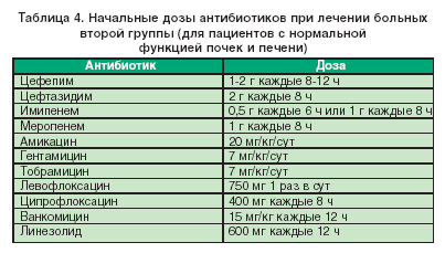 Через 48-72 часов после начала терапии возможны коррекция АБТ и переход на антибиотики более узкого спектра действия (согласно результатов микробиологических исследований). Если больной получал аминогликозиды, их можно отменить через 5-7 дней лечения (при условии хорошего клинического ответа на терапию). Общая продолжительность АБТ – 7-14 дней.