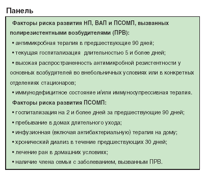 В соответствии с приведенным выше определением [1], больные с ПСОМП не относятся к лицам с НП. Однако спектр возбудителей этого заболевания и вероятность инфицирования антибиотикорезистентными бактериями сопоставимы с таковыми у больных с НП, поэтому при лечении пациентов с ПСОМП следует руководствоваться теми же принципами, что и при терапиибольных с НП.