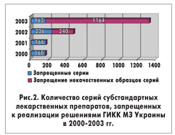 За период 2003-2004 гг. был принят ряд нормативно-правовых актов: приказ МЗ Украины № 497 от 12.12.01 «Об утверждении Порядка запрета (изъятия) из обращения лекарственных средств на территории Украины» и приказ МЗ Украины № 436 от 30.10.01 «О порядке контроля качества лекарственных средств во время оптовой и розничной торговли». В течение этих лет ведущие фармацевтические предприятия страны уже получили первые национальные сертификаты GMP. Но, как известно, приказов у нас множество, только вот реальная польза от них не всегда прослеживается. Однако законодательные акты, регламентирующие взаимоотношения ГИКК и операторов фармацевтического рынка Украины, в нашей стране работают достаточно эффективно. На конгрессе «Лекарства и жизнь» первый заместитель Главного государственного инспектора Украины по контролю качества лекарственных средств В. Г. Варченко детально остановился на основных пунктах вышеобозначенных приказов, подчеркнув, что они максимально гармонизированы с требованиями Европейского содружества в отношении оборота ЛС и товаров медицинского назначения.