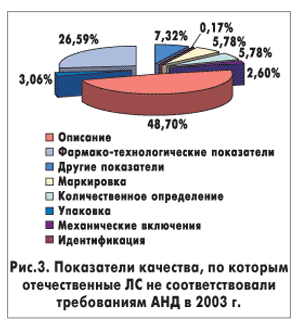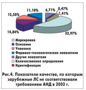 Показатели качества, по которым ЛС не соответствовали требованиям аналитической нормативной документации (АНД) в 2003 г., по данным ГИКК, свидетельствуют о том, что ситуация на фармацевтическом рынке в отношении качества отечественных и зарубежных ЛС практически равноценна (рис. 3, 4).