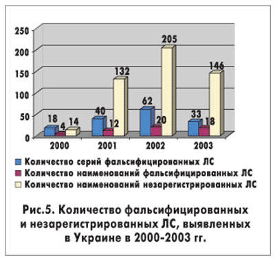 По оценкам экспертов ВОЗ, мировой оборот продаж фальсифицированных ЛС оцениваются в 20 млрд. долларов США — около 7% объема мирового фармацевтического рынка. Основная доля приходится на СНГ и страны третьего мира. В 2003 г. в Украине выявлено и изъято из обращения 118 серий субстандартных, 26 серий фальсифицированных ЛС и 95 наименований не зарегистрированных готовых ЛС. Осуществлена проверка 2757 субъектов хозяйственной деятельности относительно требований законодательства к качеству ЛС.