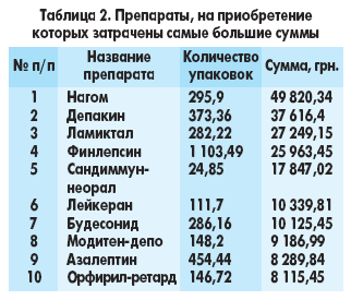 Согласно полученным данным по бесплатным рецептам в г. Виннице в 2004 году отпущено лекарственных препаратов на сумму 415 856, 74 грн. Анализируя их количество и затраты на приобретение, мы выделили 10 наиболее часто назначаемых препаратов и 10 наиболее дорогостоящих (табл. 1, 2).