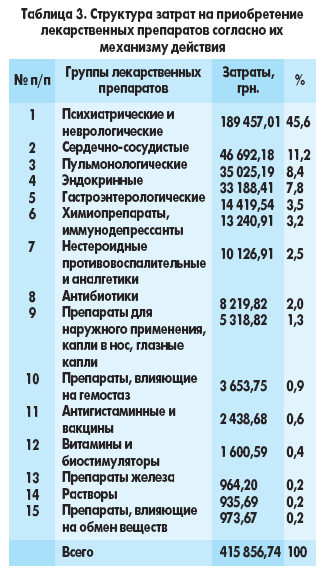 Для оценки адекватности расходов бюджетных средств на приобретение медикаментов по бесплатным рецептам мы проанализировали количество препаратов различных групп и их стоимость и сопоставили с нозологической структурой инвалидов г. Винницы, которые являются основными потребителями этих медикаментов.