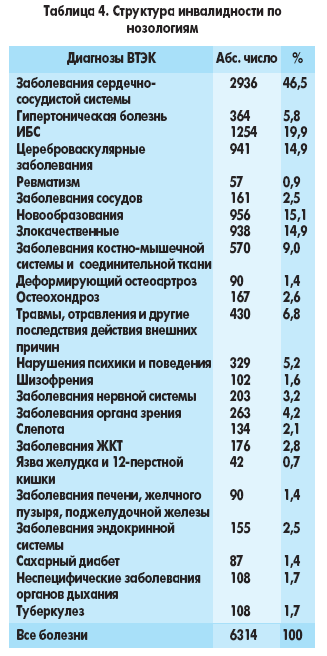 В 2004 году, по данным городской ВТЭК, освидетельствовано и признано инвалидами 6 314 человек, большинство из них пациенты с заболеваниями сердечно-сосудистой системы – 46,5% (табл. 4), далее следуют больные с новообразованиями (15,1%), заболеваниями опорно-двигательного аппарата (9%), травмами (6,8%), с инвалидизирующими нарушениями психики и поведения (всего 5,2%).