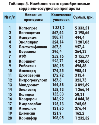 Всего на приобретение препаратов с неподтвержденной, согласно требованиям доказательной медицины, эффективностью (милдронат, АТФ, рибоксин, актовегин) затрачено 12 193,62 грн., что составило 26,1% от суммы, потраченной на приобретение сердечно-сосудистых средств. Как показали наши расчеты, этой суммы хватило бы на обеспечение годичного курса лечения бисопрололом 25 больных (301 упаковка) или липразидом (10 мг лизиноприла + 12,5 мг гипотиазида) – 86 больных (1033 упаковки). Эта же сумма могла быть потрачена на лечение амлодипином 46 больных (554 упаковки) в течение года или на липидоснижающую терапию ловастатином для 36 больных (428 упаковок).
