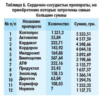Как показал анализ затрат на приобретение сердечно-сосудистых медикаментов, наибольшие суммы затрачены на покупку ингибиторов АПФ (каптопрес, эналозид, диротон), метаболитных (милдронат, АТФ, предуктал) и сосудистых (актовегин, винпоцетин) препаратов (табл. 6).