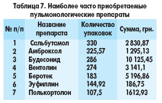 Анализ рациональности затрат на приобретение медикаментов для лечения пульмонологических больных показал, что чаще всего врачи выписывали рецепты на препараты не для базисной терапии бронхиальной астмы (именно эта категория пульмонологических больных является льготной), а на средства, предназначенные для снятия приступов удушья (сальбутамол, вентолин, беротек, эуфиллин) (табл. 7).