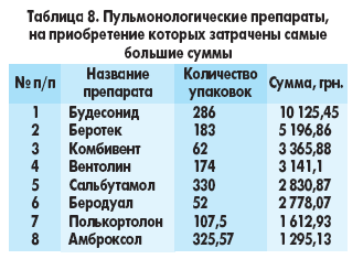 Группа симптоматических бронхолитических препаратов представлена довольно широко и включает как достаточно эффективные с низкой частотой побочных эффектов (сальбутамол, вентолин), так и менее селективные препараты (беротек), и комбинированные средства (комбивент, беродуал). Общая сумма (17 312,78 грн.) на их приобретение в 1,7 раза превышала ту, которая потрачена на будесонид (10 125,45 грн.).