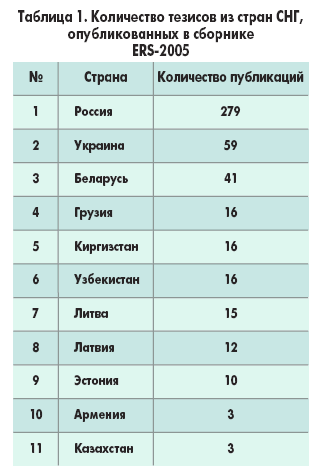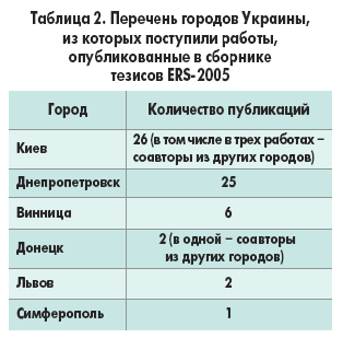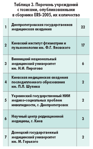 О тех, кто пишет. Лидером среди отечественных авторов, представленных в сборнике ERS, является член корреспондент АМН Украины, профессор Т.И. Перцева (Днепропетровская медицинская академия), ее фамилия фигурирует 9 раз, 5 раз в материалах встречаются фамилии доктора медицинских наук С.И. Черeнко (Киевский институт фтизиатрии и пульмонологии им. Ф.Г. Яновского), Я. Волошина (Киевский институт фтизиатрии и пульмонологии им. Ф.Г. Яновского), Р. Бонцевич (Днепропетровская медицинская академия). Теперь об украинских авторах, публикации которых представлены более двух раз: Ю.И. Фещенко, Ю.М. Мостовой, Н.Г. Горовенко, Б. Венгеров, О. Суховерхая.