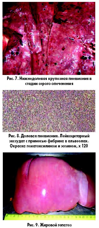 Тяжелое течение ВП, осложненной септическим шоком и плевритом, иллюстрирует случай больного Ч., 28 лет, госпитализированного СМП в сопровождении родственников с диагнозом «правосторонний плеврит». Со слов родственников в анамнезе полинаркомания, в течение последних 3 лет злоупотребляет алкоголем, другие психоактивные вещества не принимает. Предшествующие заболеванию 6 дней находился в запое. При обследовании в приемном отделении стационара жалобы на сухой кашель с сильной болью в правой половине грудной клетки и при дыхании, лихорадку до 38,5°С. Считает себя больным около 3 суток, однако за медицинской помощью не обращался. Самостоятельно принимал анальгин, панадол. Объективно: состояние тяжелое, запаха алкоголя нет, сознание спутанное, лихорадка 38,3°С, выраженная гиперемия кожи, тахипноэ 26 в мин., АД 100/60, ЧСС 110 в мин. Выраженное притупление перкуторного звука над правым легким, дыхание резко ослаблено. Слева дыхание жесткое, единичные сухие хрипы. Печень увеличена на 2 см. Признаков портальной гипертензии нет. При рентгенографии легких в приемном отделении – правосторонняя пневмония, плеврит. Больной госпитализирован в отделение интенсивной терапии. В анализе крови Hb 96 г/л, лейкоциты 20х109/л, СОЭ 36 мм/ч, мочевина 48 ммоль/л, креатинин 984 мкмоль/л, билирубин 29 мкмоль/л, амилаза 130 Ед/л, SaO2 87%. Консультирован центром отравлений Института скорой помощи – данных за отравление не получено, специализированная помощь не показана. Больному назначена антибактериальная терапия: цефотаксим, ципрофлоксацин и метронидазол; ингаляция 30% кислородной смеси, преднизолон 240 мг в сутки, допамин. Через 40 часов, несмотря на проводимое лечение, больной скончался при явлениях тяжелой интоксикации и септического шока. На вскрытие направлен с клиническим диагнозом «Сепсис. Полинаркомания. Алкогольная поливисцеропатия. Токсический гепатит, токсическая энцефалопатия. Правосторонняя пневмония с плевритом. Острый панкреатит. Интоксикация тяжелой степени. Полиорганная недостаточность. Отек мозга».