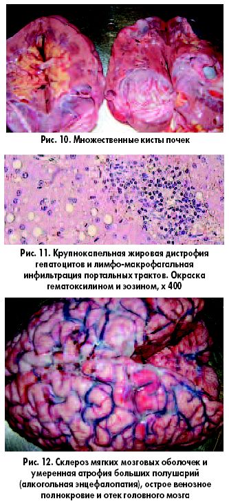 Больной Т., 50 лет, госпитализирован СМП с диагнозом «алкогольное опьянение». При осмотре в приемном отделении: контакт затруднен, сознание спутано. Объективно: состояние средней тяжести, запах алкоголя – взята проба на алкоголь, бледный, отеков нет, нормального питания. Температура тела 36°С, АД 130/70, ЧСС 100 в мин, тахипноэ 21 в мин. Перкуторный звук легочный. При аускультации дыхание проводится во все отделы легких, справа в нижних отделах – жесткое. Печень не увеличена. Признаков портальной гипертензии нет. Стул был. Мочеиспускание по катетеру, более 1000 мл. Больной госпитализирован в отделение интенсивной терапии, где был осмотрен психиатром и была начата дезинтоксикационная терапия. В анализах крови Hb 126 г/л, лейкоциты 9х109/л, СОЭ 23 мм/ч, мочевина 6,7 ммоль/л, билирубин 56 мкмоль/л, SaO2 94%. На фоне лечения в течение 2 суток – восстановление сознания и ориентации в происходящем, общее состояние удовлетворительное. К 3-м суткам госпитализации у больного развился абстинентный синдром, алкогольный делирий, сопор, субфебрильная лихорадка. При рентгенографии выявлена картина очаговой пневмонии в нижней доле правого легкого. В анализах крови лейкоциты 15х109/л. Больному назначена антибактериальная терапия (цефотаксим, ципрофлоксацин, метронидазол), приведшая к существенному улучшению состояния и снижению температуры тела до нормальной. Однако соответствующей положительной рентгенологической динамики нe получено. К 6 суткам лечения у больного вновь появилась фебрильная лихорадка, состояние прогрессивно ухудшалось, и на 10 сутки стационарного лечения на фоне симптомов нарастающего отека головного мозга больной скончался. На вскрытие направлен с диагнозом «Алкогольная энцефалопатия. Правосторонняя нижнедолевая пневмония на фоне алкогольной поливисцеропатии. Алкогольный цирроз печени, индуративный панкреатит, алкогольная полинейропатия. Интоксикация, отек мозга».