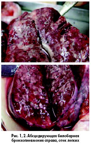 Основное заболевание: абсцедирующая билобарная бронхопневмония в нижней и средней долях справа.