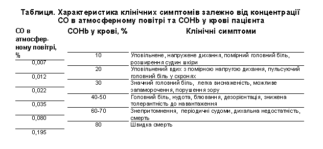Патофізіологія отруєння окисом вуглецю. Токсична дія окису вуглецю зумовлена його взаємодією із двовалентним залізом гемоглобіну крові й утворенням COНb- карбоксигемоглобіну, який не здатний переносити кисень з легень до тканин, що є причиною гемічної гіпоксії. Крім того, великий вміст СО у крові погіршує здатність оксигемоглобіну до дисоціації. Окис вуглецю, з’єднуючись у клітинах з цитохромами, цитохромоксидазою, міоглобіном, порушує в них окислювально-відновні процеси, що призводить до тяжкого кисневого голодування тканин.