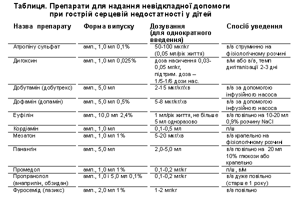 Таблиця. Препарати для надання невідкладної допомоги при гострій серцевій недостатності у дітей