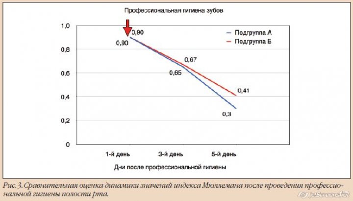 Определение индекса кровоточивости проводили перед проведением профессиональной гигиены, на 3- и 5-й день применения геля Метрогил Дента® или ротовых ванночек с хлоргексидином. Установлено, что у пациентов подгруппы А динамика индекса Мюллемана достоверно не отличалась от аналогичного индекса подгруппы Б: так, у пациентов подгруппы А значение индекса до проведения профессиональной гигиены составило 0,9±0,17; через 3 дня значение индекса уменьшилось до 0,65±0,11; а через 5 дней оно составило 0,30±0,14. Для пациентов подгруппы Б были получены следующие значения: 0,9±0,17; на 3-й день – 0,67±0,09; на 5-й день – 0,41±0,12. Несмотря на то что полученные различия статистически недостоверны, сравнение абсолютных величин значений индекса Мюллемана указывает на то, что купирование воспалительного процесса в подгруппе А, где пациенты использовали аппликации геля Метрогил Дента®, происходило быстрее, чем в подгруппе Б, где для полосканий применяли раствор хлоргексидина (рис. 3).