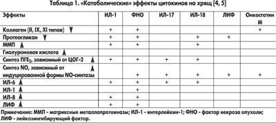 Основная роль в регуляции метаболизма хряща принадлежит хондроцитам, функциональная активность которых регулируется разнообразными медиаторами (цитокины, факторы роста, простагландины — ПГ и др.) С другой стороны, сами хондроциты синтезируют медиаторы, регулирующие синтез (анаболизм) и деградацию (катаболизм) компонентов хрящевого межклеточного вещества (табл. 1). В норме эти процессы сбалансированы, однако при ОА наблюдается нарушение нормального обмена хрящевой ткани в сторону преобладания катаболических процессов над анаболическими [5]. Существенное значение в развитии катаболических процессов в хряще при ОА имеют «провоспалительные» цитокины, особенно ИЛ-1. Кроме того, при ОА в хондроцитах наблюдается гиперэкспрессия нескольких ферментов, которые играют важную роль в повреждении хряща. К ним относятся циклооксигеназа-2 (ЦОГ-2) — фермент, регулирующий синтез ПГ — медиаторов воспаления и боли, и индуцируемая изоформа синтетазы оксида азота (II)-NO — фермент, регулирующий образование NO, который индуцирует апоптоз хондроцитов [10].