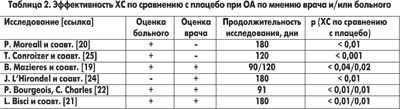 Согласно данным метаанализа, проведенного группой экспертов Постоянного комитета по международным клиническим испытаниям (ESCISIT) Европейской противоревматической лиги [31] и Т. McAlindon и соавт. [32], ХС эффективно уменьшает боль и улучшает функцию коленного и тазобедренного суставов при ОА. Однако, по мнению экспертов, методологическое качество проведенных исследований все же было недостаточно высоким (отсутствие многоцентровых исследований, короткая продолжительность испытаний, небольшое число рандомизированных больных, отсутствие анализа в зависимости от назначенного лечения и др.), а способность препарата тормозить прогрессирование ОА требует дальнейшего подтверждения [31, 32]. Поэтому в настоящее время в США планируется проведение многоцентрового 16-недельного двойного слепого контролируемого исследования в 4 параллельных группах: плацебо, глюкоза-минсульфата (по 500 мг 3 раза в день), ХС (по 400 мг 3 раза в день) и комбинации обоих препаратов [33].