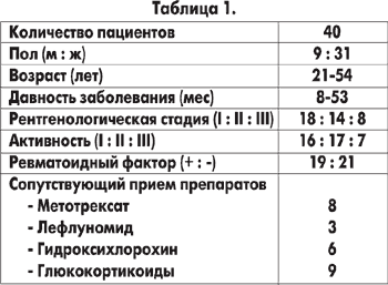 Мы проводили перекрестное исследование эффективности и безопасности применения вышеназванных препаратов. Характеристики больных по таким критериям, как возраст, давность заболевания, рентгенологическая его стадия и активность, наличие положительного ревматоидного фактора, сопутствующий прием лекарственных препаратов представлены в таблице 1.