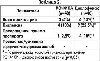 Частота побочных эффектов при приеме РОФИКИ и диклофенака в нашем исследовании представлена в таблице 2.