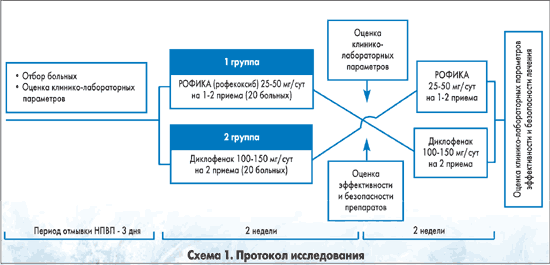 Протокол исследования представлен на схеме 1. Первые три дня оценивались исходные клинико-лабораторные параметры. Затем пациентов распределяли на две группы. Первая группа пациентов (20 человек) применяла РОФИКУ 25-50 мг в сутки в течение 2 недель; вторая группа (20 человек) применяла диклофенак 100-150 мг в сутки. По истечении 2 недель производили оценку клинико-лабораторных параметров. Затем в группах меняли препарат (РОФИКУ на диклофенак и наоборот), который пациенты применяли в течение последующих 2 недель, после чего производилась оценка эффективности лечения.